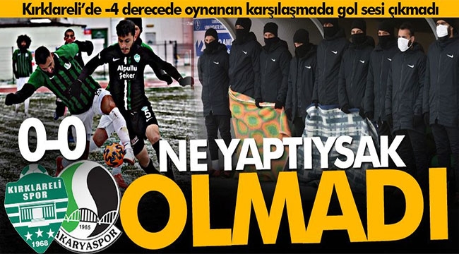 Ne yaptıysak olmadı -4 derecede gol sesi çıkmadı.. Sakaryaspor ligin 23'üncü haftasında deplasmanda Trakya temsilcisi Kırklarelispor'a konuk oldu. Oldukça soğuk bir havada oynanan karşılaşma 0-0 beraberlikle sona erdi.
