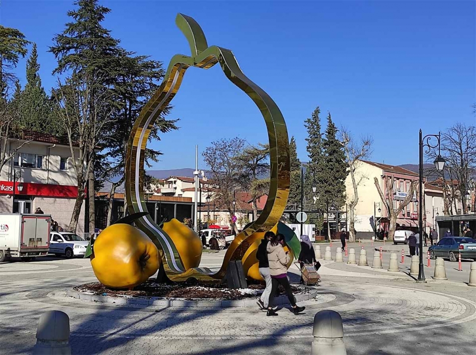 Geyve Meydanı'ndaki stilize ayva heykelinin her iki yanına ilk proje taslaklarında yer alan üç boyutlu ayva heykeli getirildi.