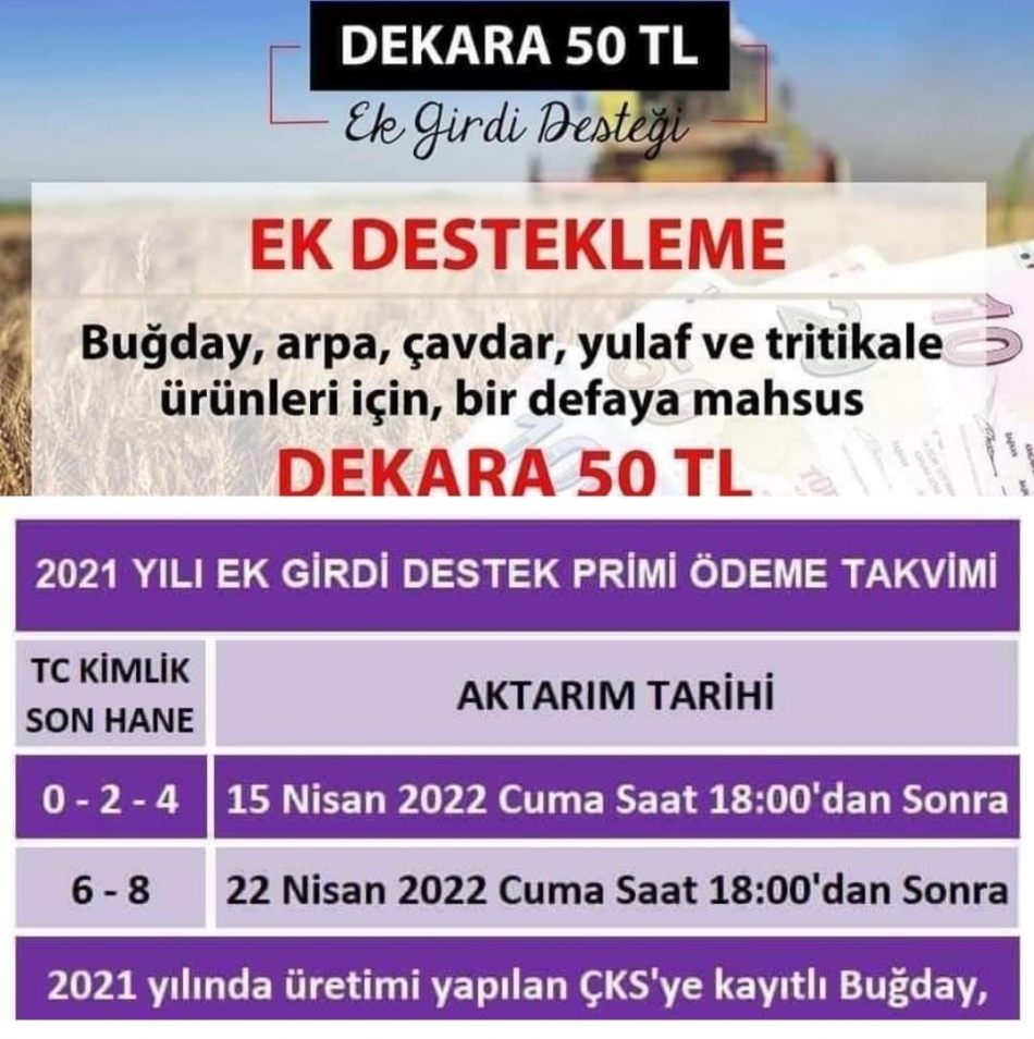 50 LİRA EK GİRDİ DESTEĞİ ÖDENİYOR