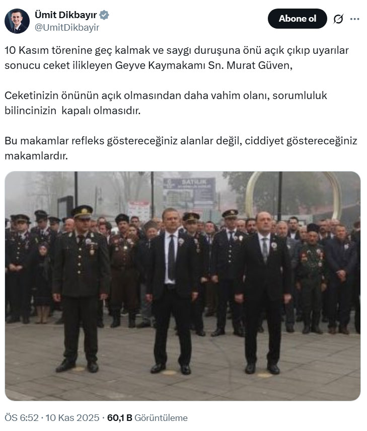 Geçtiğimiz günlerde CHP'ye katılan Sakarya milletvekili Ümit Dikbayır, bugün Geyve'de düzenlenen 10 Kasım Atatürk Anma töreninde kaymakam Murat Güven'in tutumunu eleştirdi.