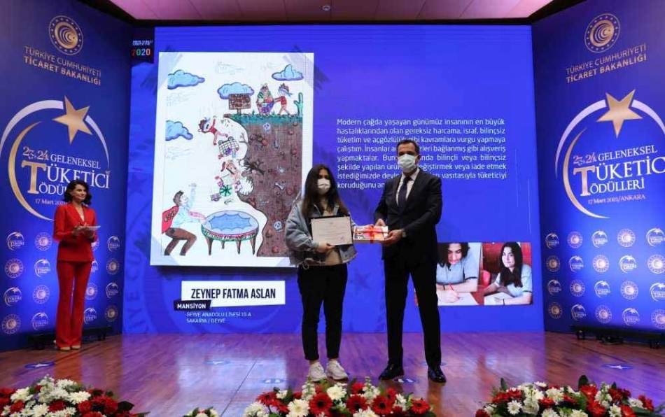 Pandemi nedeniyle sonuçları yeni açıklanan yarışmada 4. olan Geyve Anadolu Lisesi öğrencisi Zeynep Fatma Aslan, Ticaret Bakanı Ruhsar Pekcan'dan tablet ödülü aldı.