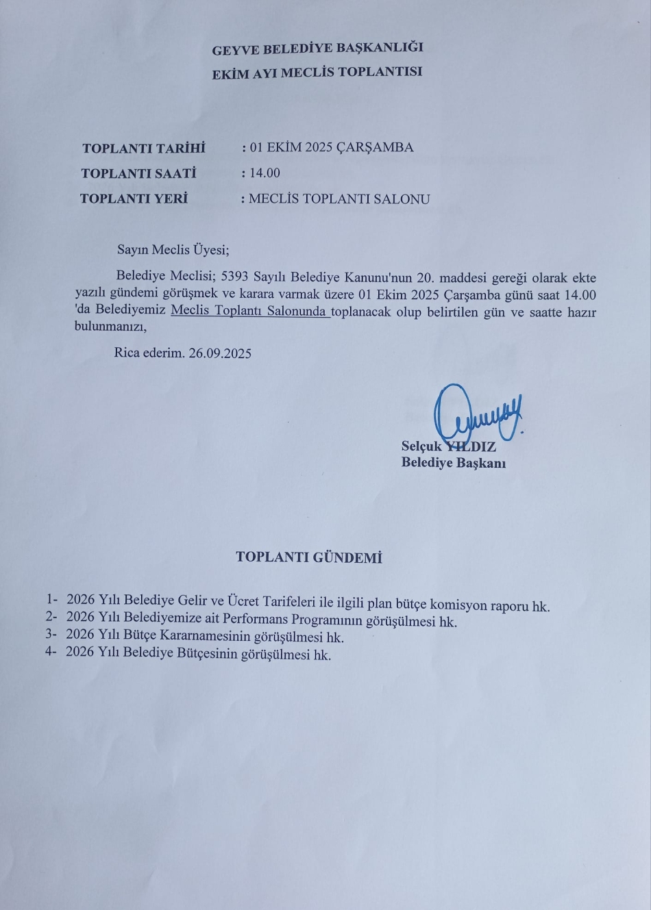 2- 2026 yılı Geyve Belediyesi'ne ait Performans Programının görüşülmesi hakkında.