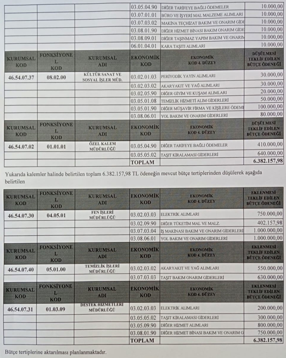 KARAR: Konu Plan ve Bütçe Komisyonunda incelenmiş, tabloda gösterilen 6 milyon 382 bin 157 TL tutarındaki ödeneğin 5393 sayılı Belediye Kanunu 18/B maddesi ile Mahalli İdareler Bütçe ve Muhasebe Yönetmeliğinin 36. maddesi uyarınca Bütçe ve Kurumsal ortama yapılan gelirler arasında aktarma yapılmasına toplantıya katılan üyelerce oy birliği ile karar verildi.