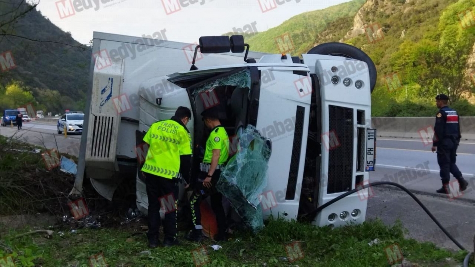 Hüseyin G. idaresindeki 15 PH 11x plakalı margarin yüklü TIR, sürücüsünün kontrolünü kaybetmesi sonucu yol kenarına devrildi.