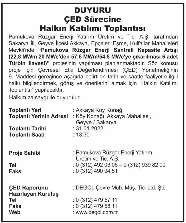 Yeni kapasite artırımının çevresel etkilerinin görüşülmesi ve değerlendirilmesi için 31 Ocak 2022 günü Akkaya'da yetkililerle halk bir araya gelecek.