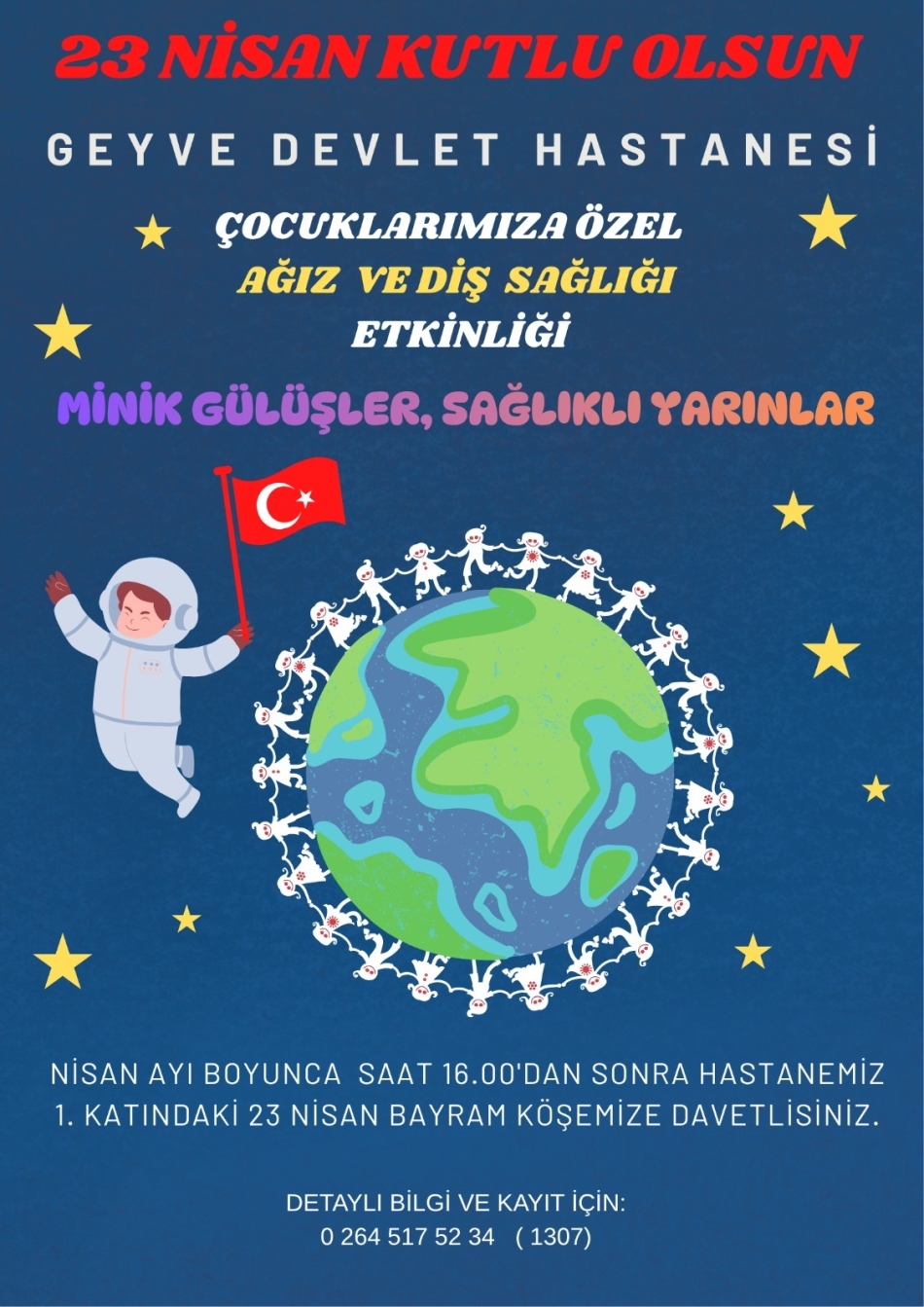 Geyve Devlet Hastanesi, 23 Nisan Ulusal Egemenlik ve Çocuk Bayramı kapsamında çocukların ağız ve diş sağlığına dikkat çekmek amacıyla özel bir etkinlik başlatıyor.