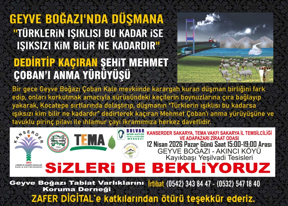 Geyve Boğazı Akıncı'da 9. Şehit Çobanı Anma Yürüyüşü düzenleniyor. Geyve Boğazı Tabiat Varlıklarını Koruma Derneğince düzenlenen geleneksel Şehit Çoban'ı Anma etkinliğinin 9.'su 12 Nisan 2026 Pazar günü saat 15:00'de Kayıkbaşı Yeşil Vadi Tesisleri'nde başlayacak.