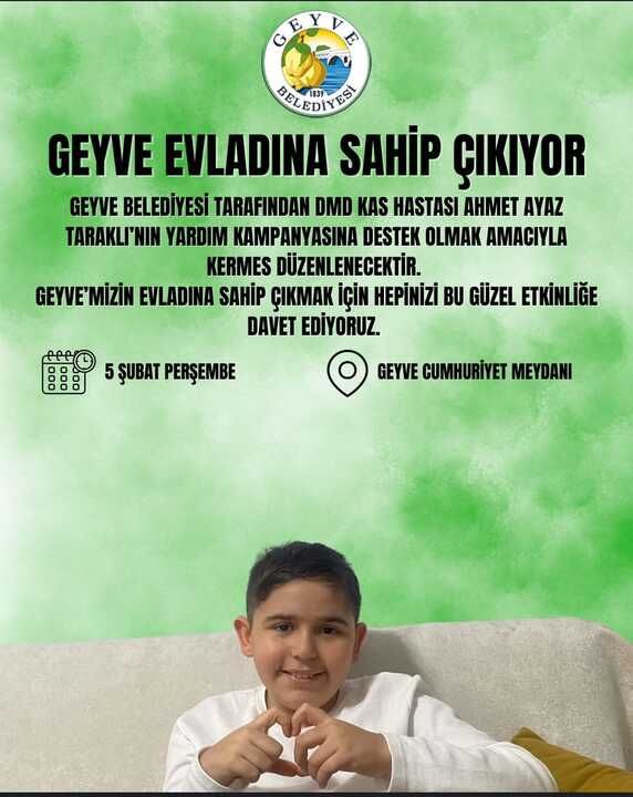 “Gün Birlik Günü, Gün Ahmet Ayaz Günü” Kampanyasına Anlamlı Destek... Geyve Belediyesi, DMD kas hastası Ahmet Ayaz için yürütülen kampanya kapsamında bugün Cumhuriyet Meydanı'nda kermes düzenliyor.