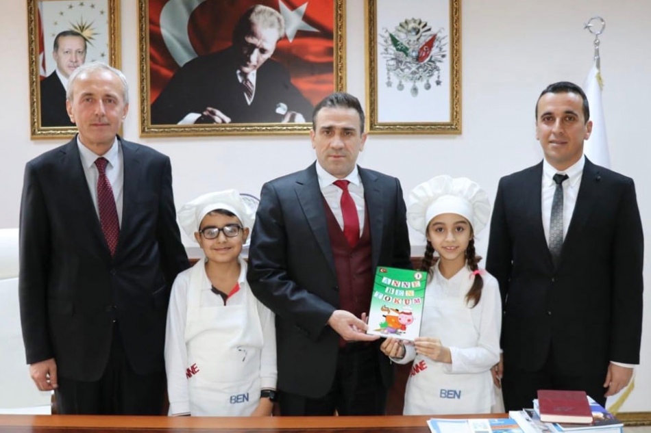 Ziyarette öğrenciler; Sınıf Öğretmeni İbrahim Yıldırım’ın rehberliğinde Tasarım-Beceri Atöylesi derslerinde yaptıkları çalışmalardan biri olan yemek yapma etkinliği neticesinde hazırladıkları “Anne Ben Tokum” adlı yemek tarifleri kitabını Kaymakam İlyas Memiş’e takdim ettiler.