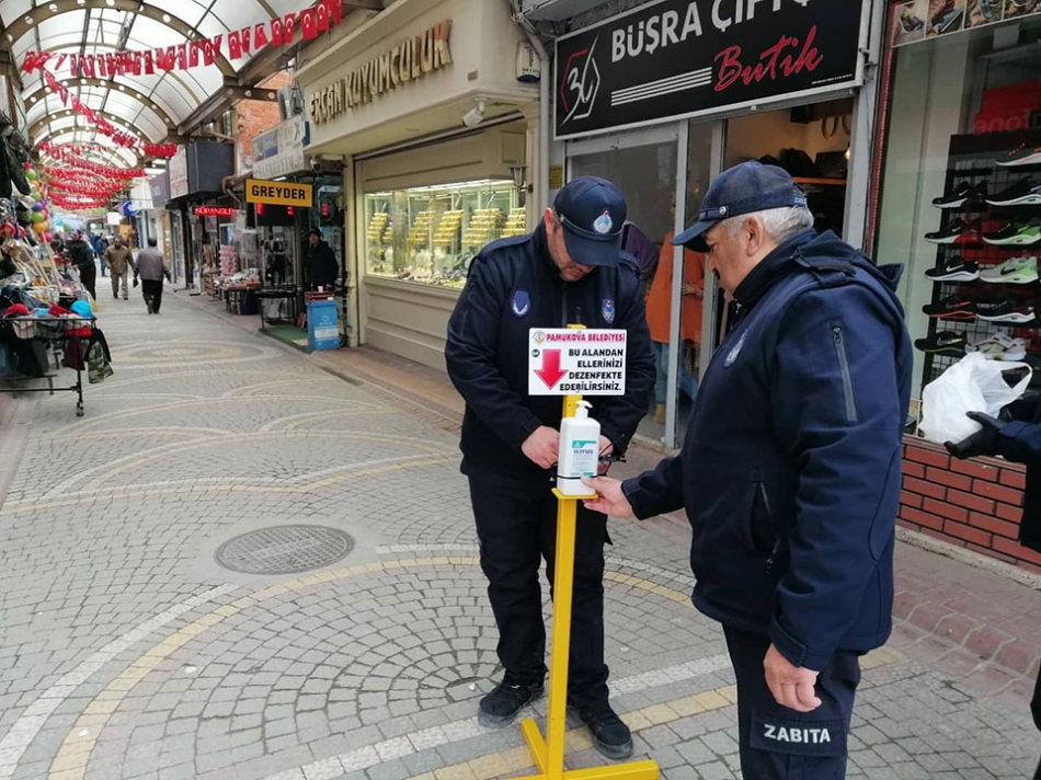 Ayrıca Pamukova Belediyesi ilçenin en kalabalık olduğu Çarşamba gününde halk pazarının kalabalık noktalarına dezenfektan otomatları konumlandırdı. Vatantaşlar bu noktalardan geçerken ellerini dezenfekte etmeyi ihmal etmedi.