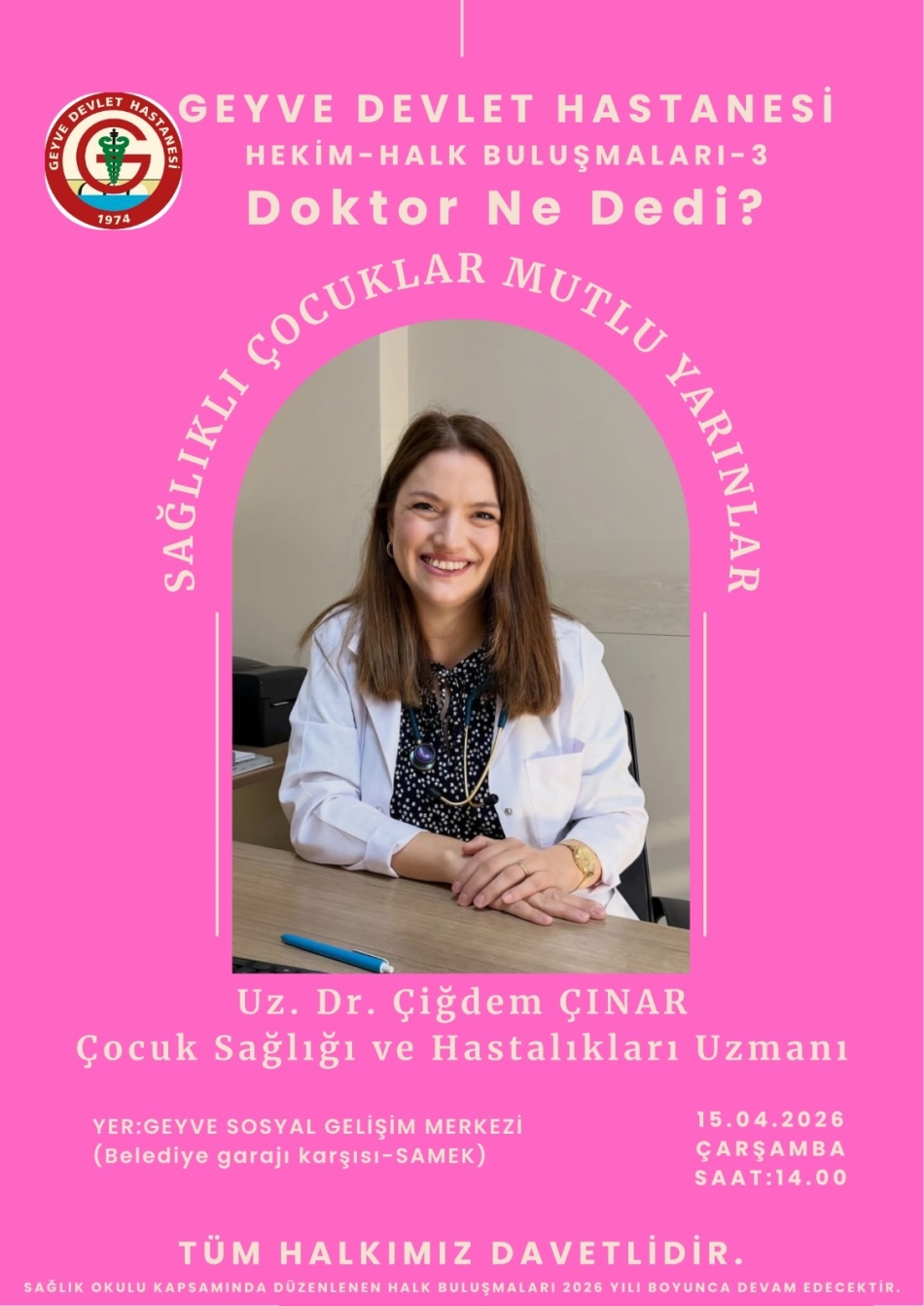 Geyve Devlet Hastanesi, Sağlık Okulu kapsamında başlattığı Hekim-Halk Buluşmaları'nın 3.'sünde Çocuk Sağlığı ve Hastalıları Uzmanı Doktor Çiğdem Çınar, Geyve halkı ile çocukların sağlığını konuşacak.